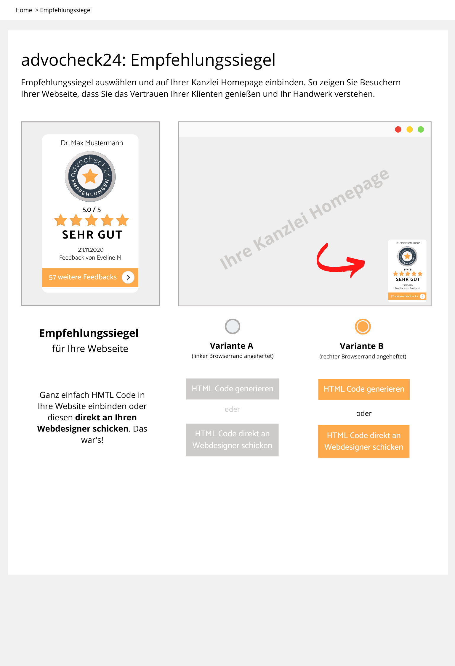 Binden Sie das verbesserte advocheck24 Empfehlungssiegel in Ihrer Webseite ein und steigern Sie das Vertrauen sowie die Kontaktaufnahme von Ihren Webseitenbesuchern um bis zu 270%*.