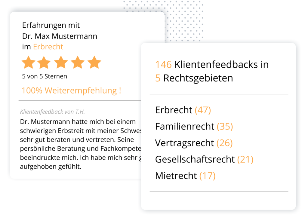 Wenn ein Rechtssuchender einen Scheidungsanwalt für seine Scheidung sucht, werden Feedbacks im bspw. Gesellschaftsrecht wenig weiterhelfen. Daher können Sie Ihre Klientenfeedbacks unterteilt in Rechtsgebieten darstellen. Somit sieht Ihr potenzieller Klient nur Erfahrungswerte, die für Ihn wirklich relevant sind.