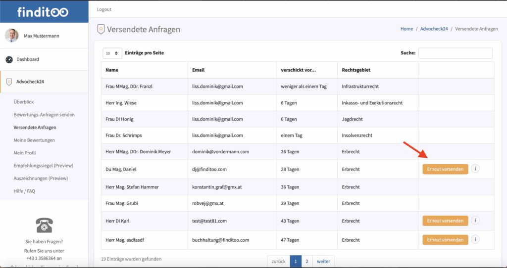Klicken Sie auf „erneut versenden“. In diesem Fall öffnet sich Ihr Email Programm mit dem individuellen Link zur Bewertungsabgabe.