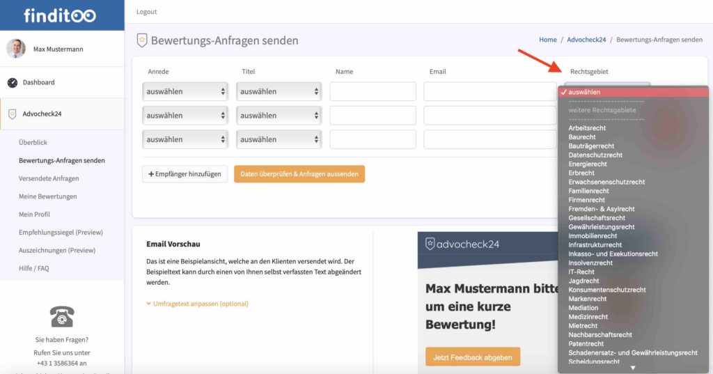 Ab sofort können Sie für alle Rechtsgebiete Bewertungen einholen. Dafür wählen Sie wie gewohnt beim Ausfüllen der Daten das Rechtsgebiet, in dem Sie den Klienten beraten haben, aus.