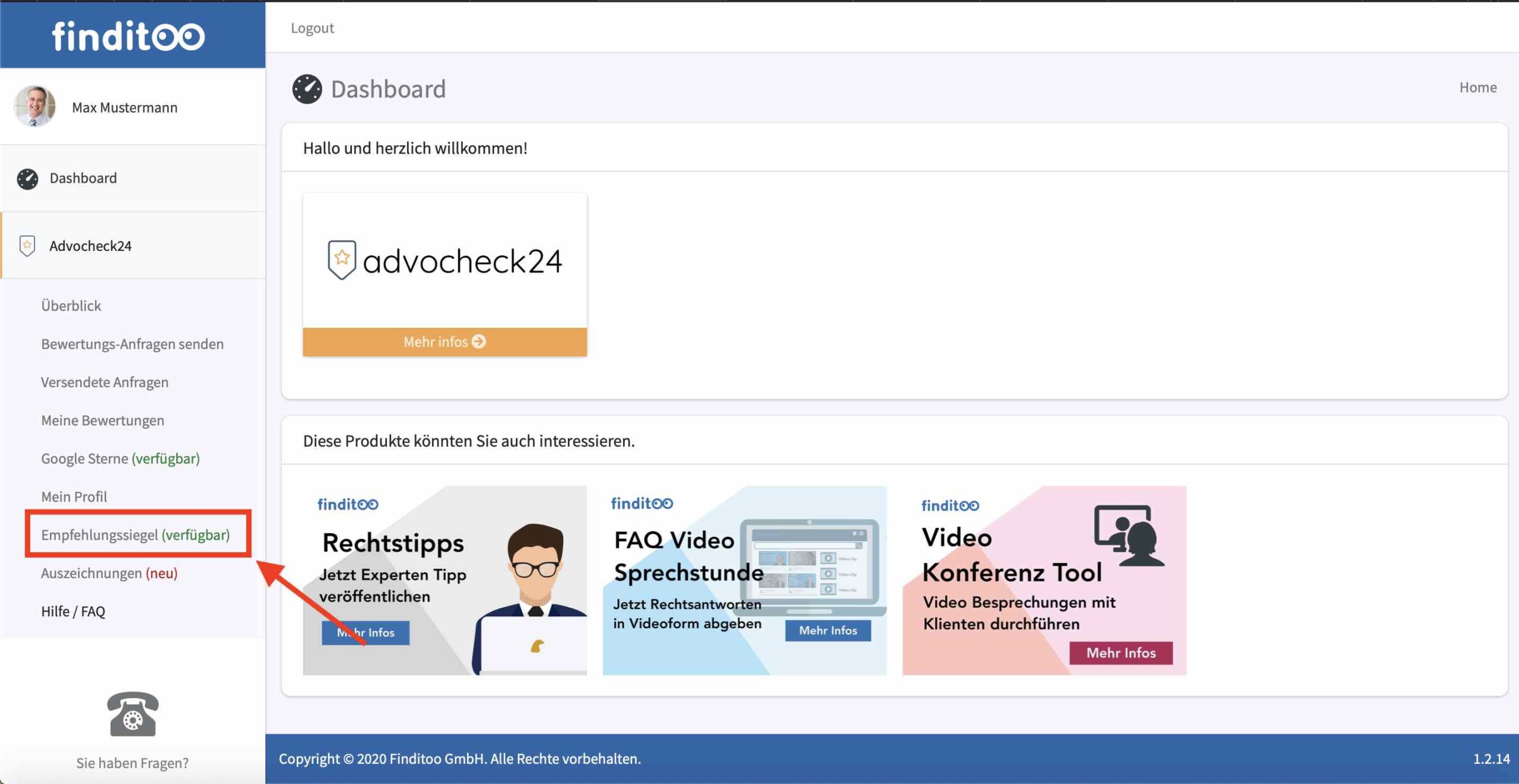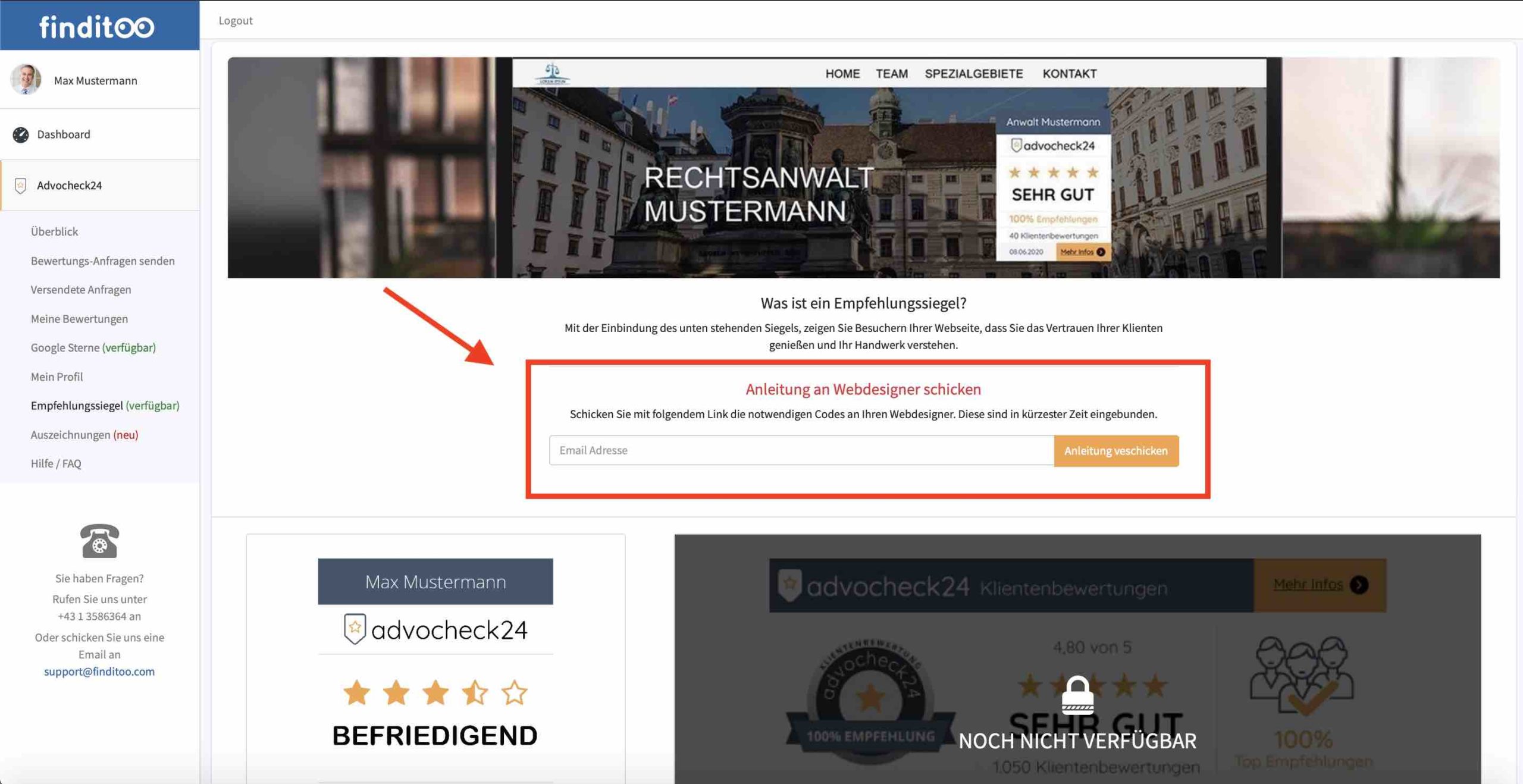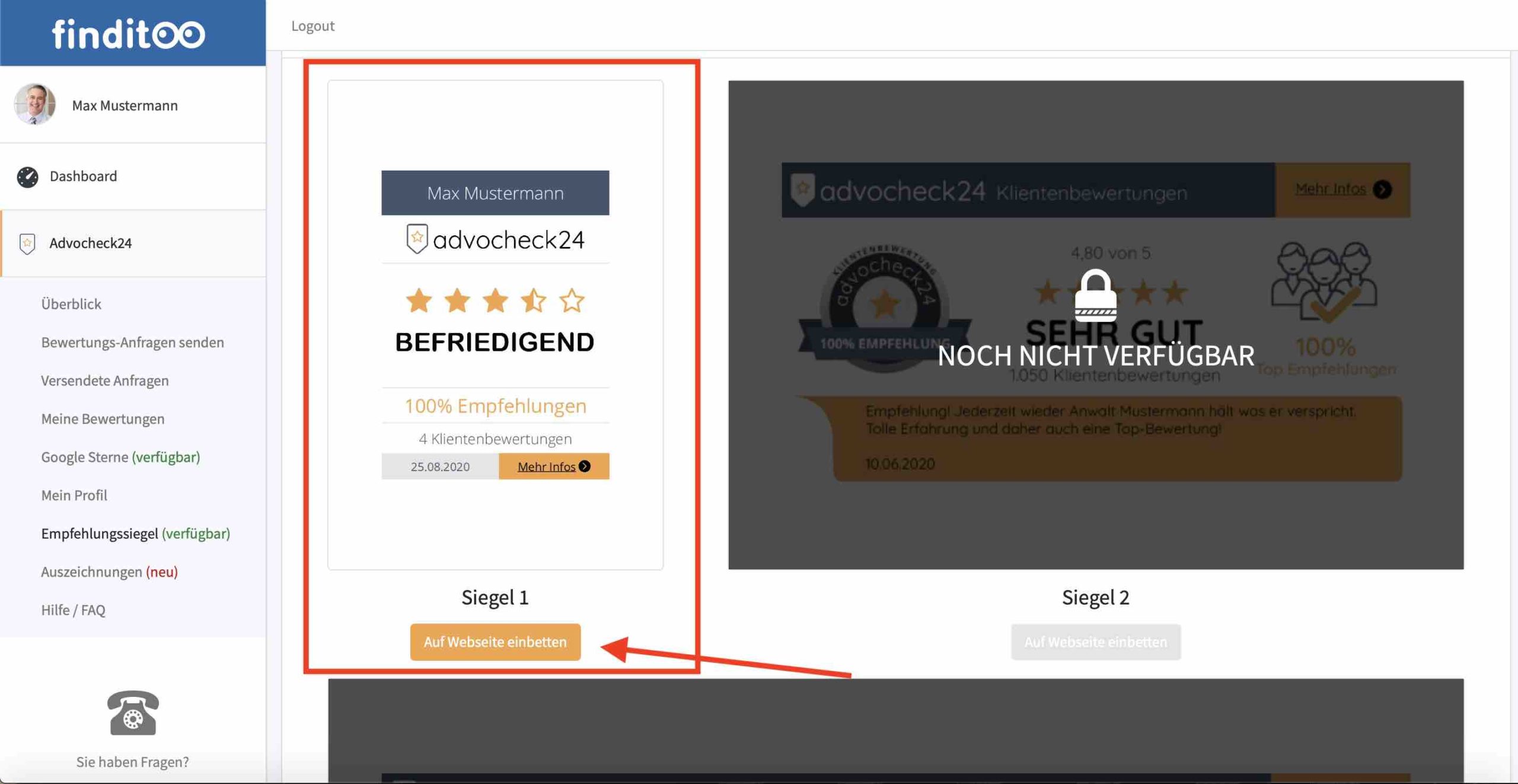 Loggen Sie sich mit Ihren Benutzerdaten in Ihr advocheck24 Backend ein und klicken Sie links in der Menüleiste auf den Punkt «Empfehlungssiegel»