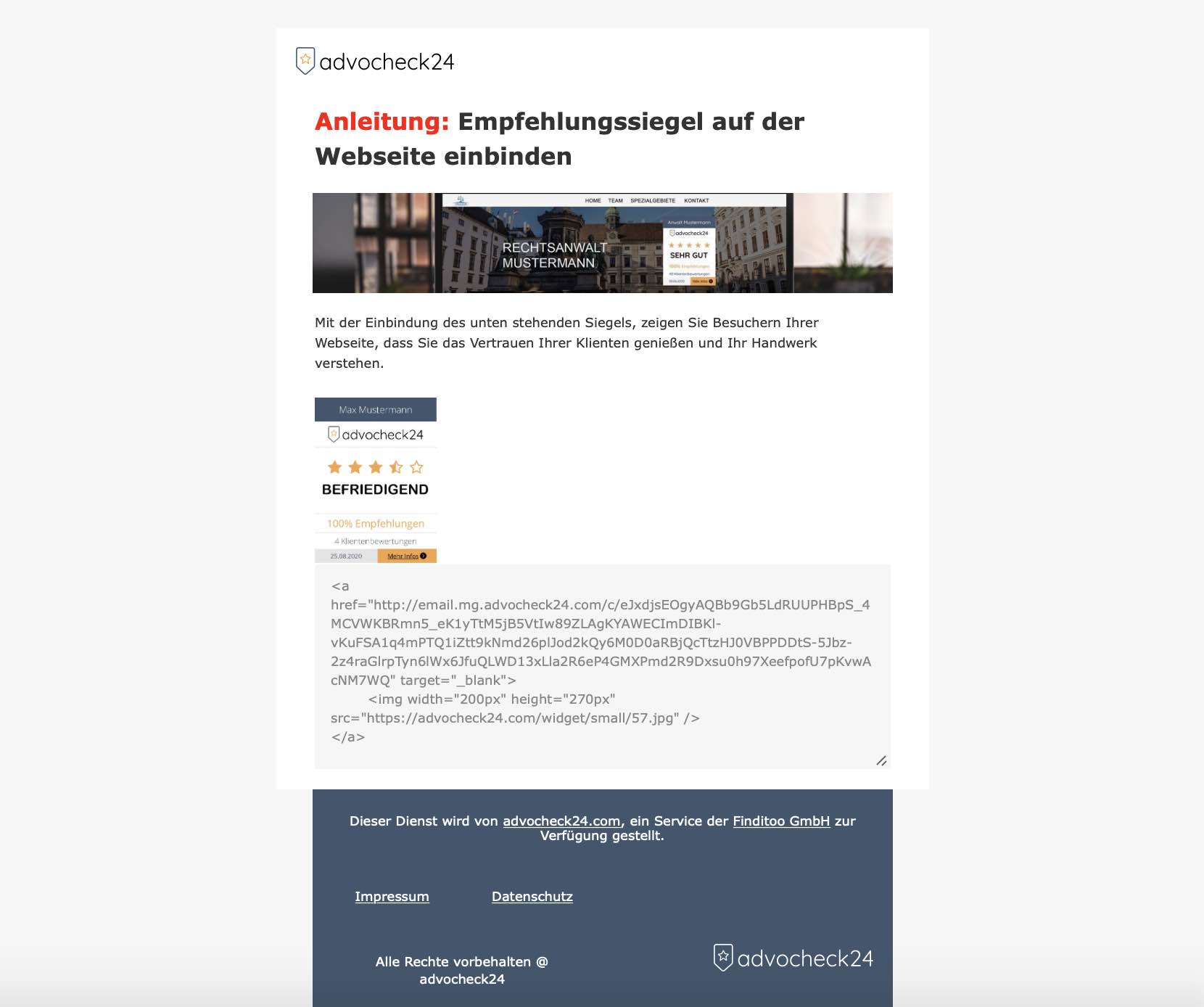 Eine kurze Zusammenfassung & Erklärung zur Einbindung geht direkt an die von Ihnen hinterlegte Email Adresse. Ihr Webdesigner kann damit das Empfehlungssiegel kinderleicht auf Ihrer Webseite einbinden. Das war’s!