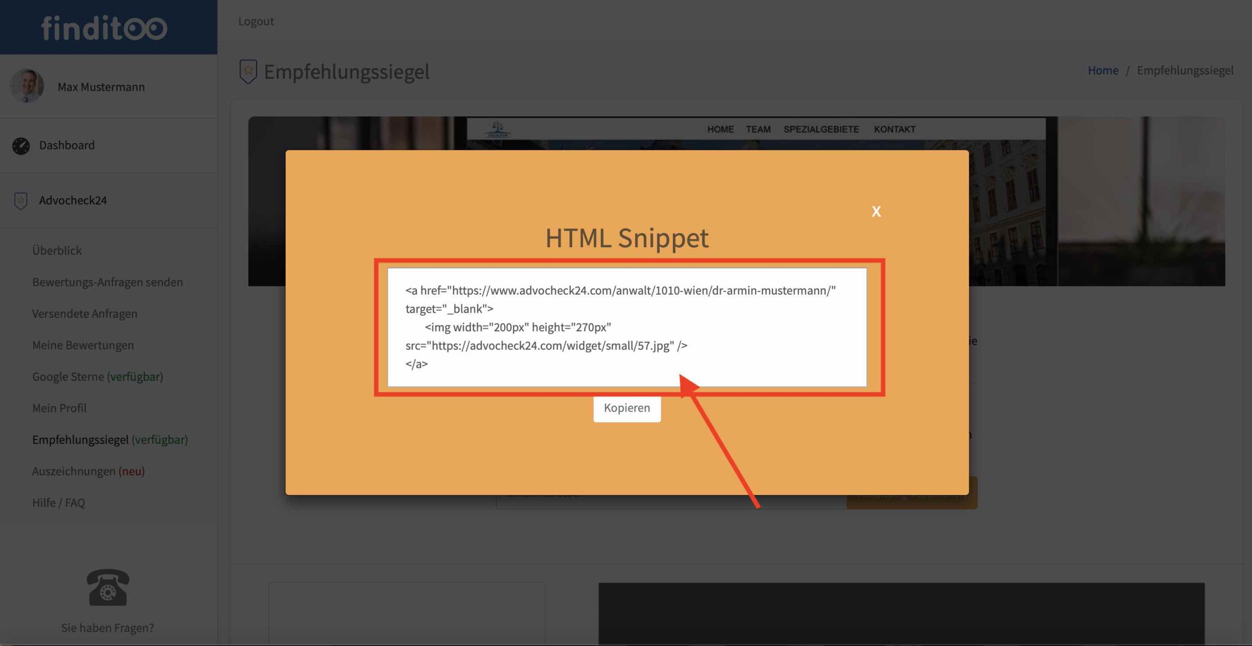 Es geht ein oranges Pop-up Feld auf. Kopieren Sie diesen Code (HTML Snippet) einfach in Ihre Webseite und das war’s. Das Empfehlungssiegel wird dann automatisch dort wo der Code eingebunden wird angezeigt.