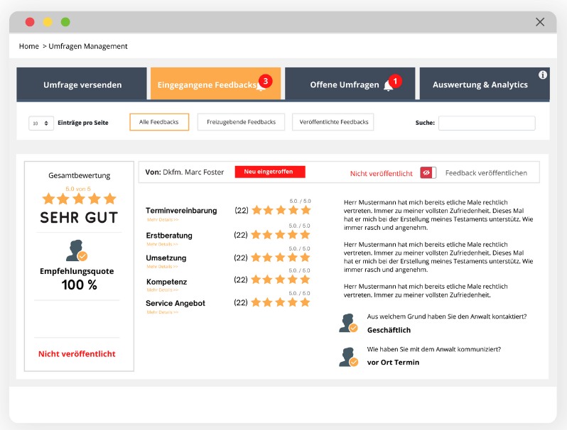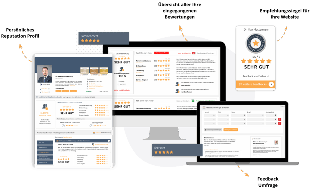 Klientenfeedback einholen, auswerten, veröffentlichen, das war's - So einfach werben Sie mit Ihrem guten Ruf als Anwalt.
