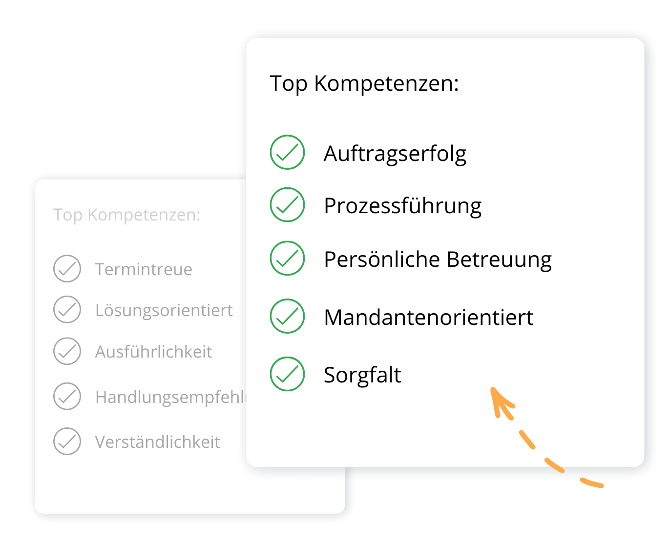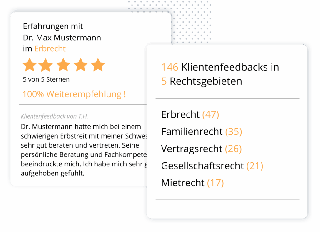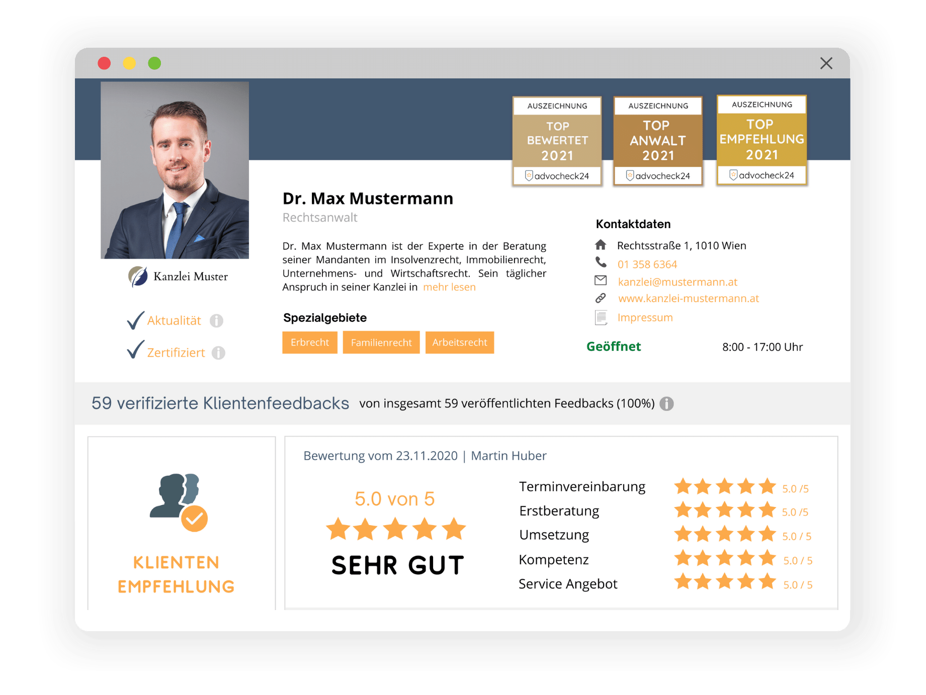Präsentieren Sie in Ihrem persönlichen advocheck24 Profil Ihren guten Ruf mit ausgewählten Empfehlungen Ihrer Klienten. So erhöhen Sie das Vertrauen von potenziellen Klienten in Ihre Qualität und Expertise.