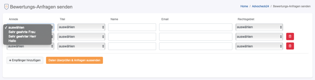 Um eine Bewertungsanfrage auszusenden müssen Sie nun einen Empfänger (Ihren Klienten) hinzufügen. Dafür geben Sie bitte im vorgegebenen Formular Anrede, Titel, Name, Email sowie das Rechtsgebiet, in dem Sie Ihren Klienten beraten haben, ein.